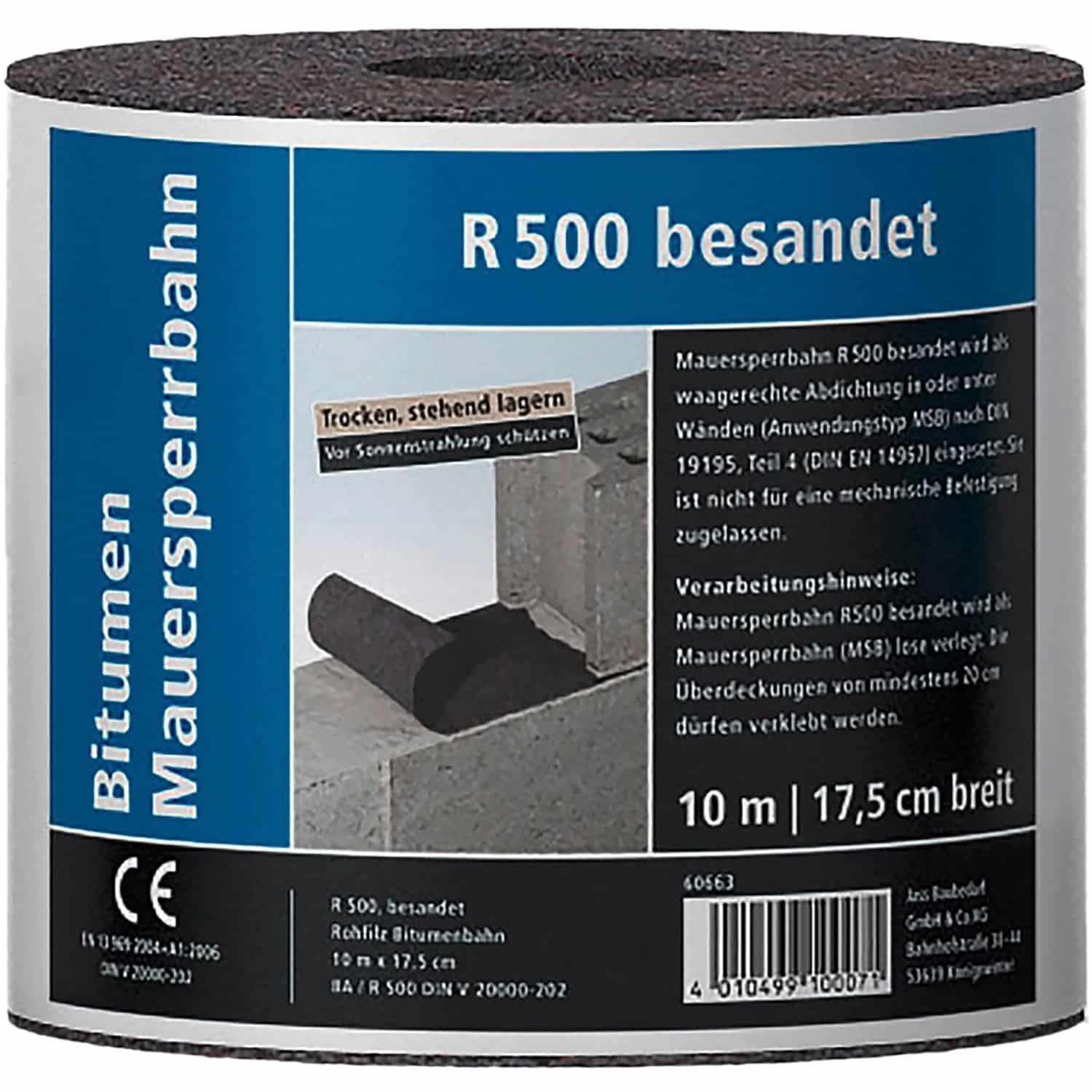 Die Mauersperrbahn R500 ist speziell für Wandstärken von 17,5 cm konzipiert. Sie bietet ausreichend Material für eine optimale Abdichtung bei dieser Wandstärke. Bitte beachten Sie, dass ein gewisser Überstand für die korrekte Verlegung und Abdichtung erforderlich ist.